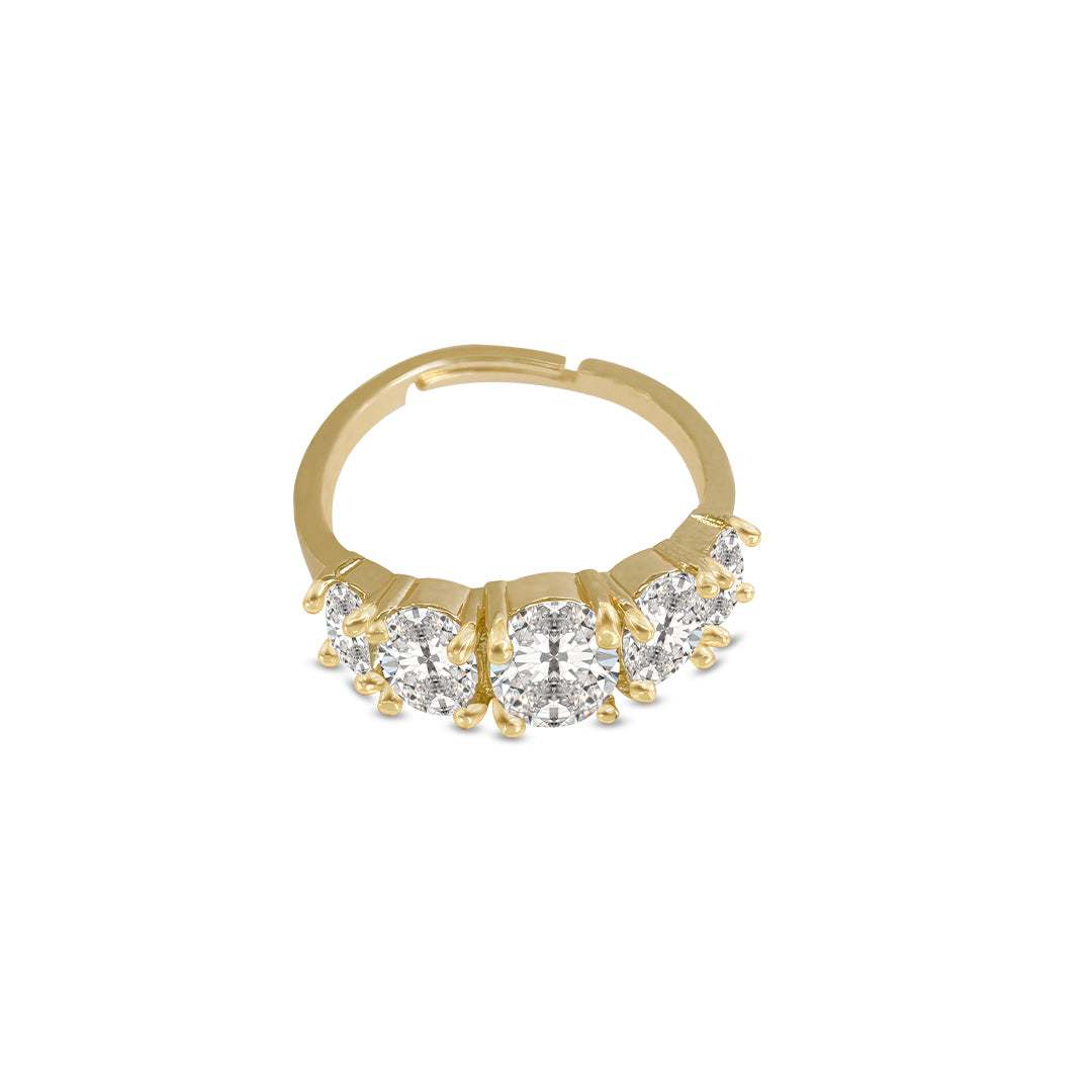 Descripción: Un impresionante anillo ajustable en tono dorado adornado con pedrería cristalina en un engaste de puntas para lograr el máximo brillo. Perfecto como pieza llamativa o para apilar, irradia lujo y sofisticación.