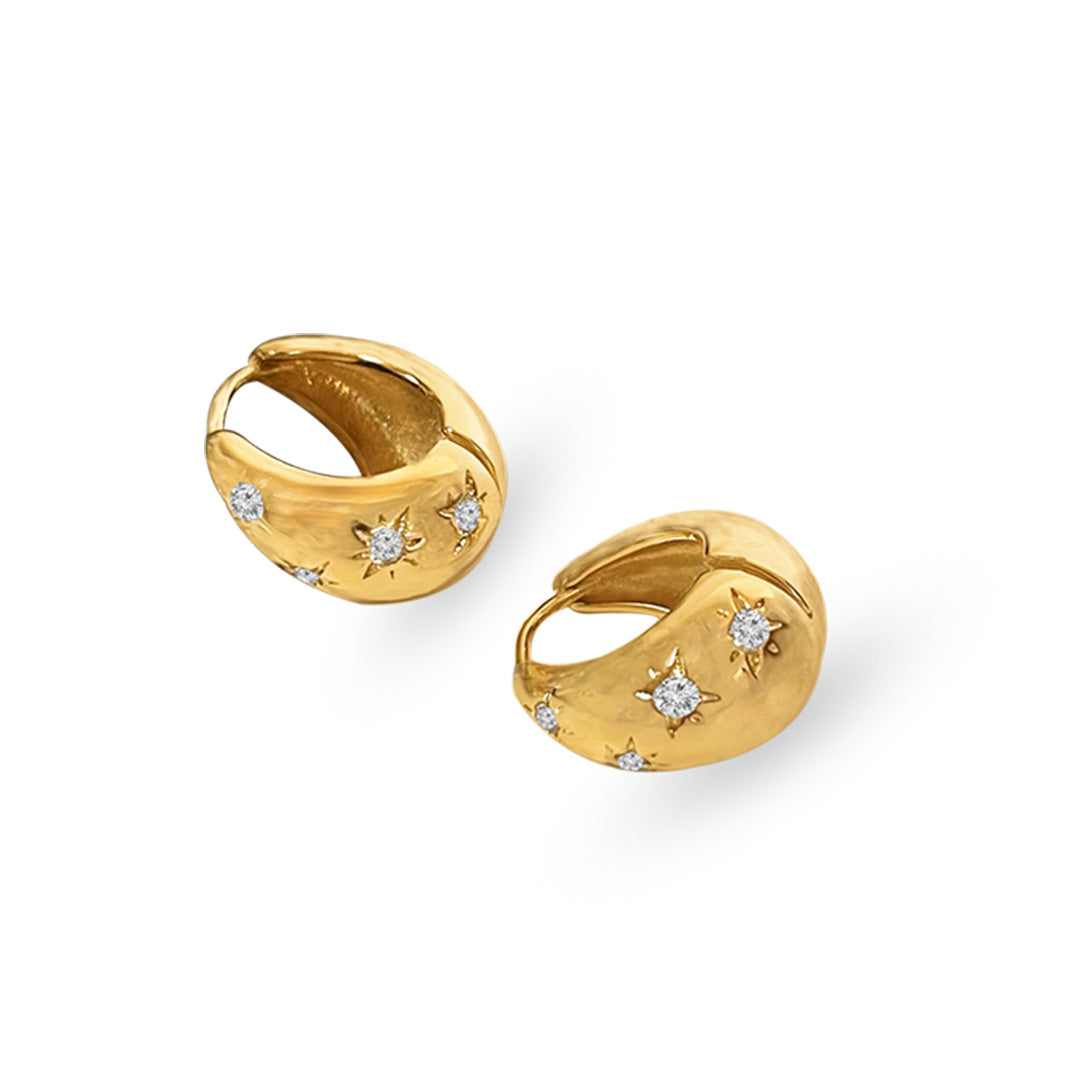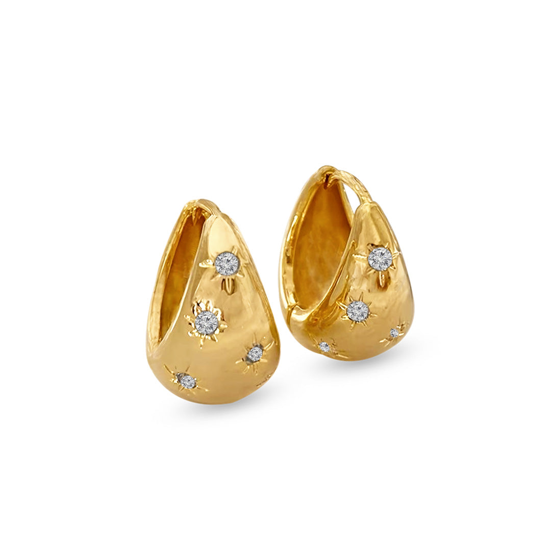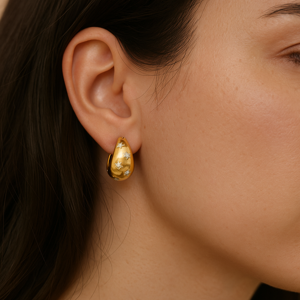 Description : Ces créoles Golden Starlight dégagent un charme céleste avec leur design en forme de larme, orné de délicates gravures en étoile et de paillettes scintillantes. Strass. Fabriqués en or poli, ils offrent une sensation à la fois luxueuse et organique, ce qui en fait une pièce intemporelle.